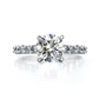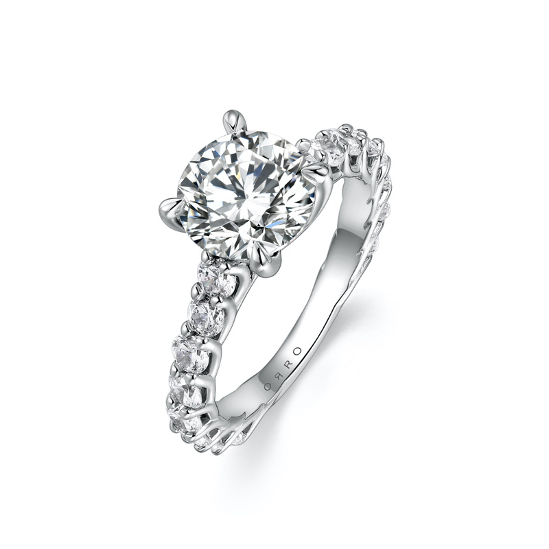The ORRO Arielle Ring exemplifies the brand’s commitment to innovation and craftsmanship. Showcasing a round brilliant centre rock, this ring features an exclusive band design, a hallmark of ORRO’s artistry. The band is adorned with ten relatively large round brilliant diamonds on each side, each secured by four prongs. These prongs are organically crafted, curving gracefully out of the band and extending up to the ¾ mark. This unique construction creates a mesmerizing floating effect for the total of 20 round brilliant gems set on both sides of the band, offering a spectacular view from every angle. Available with a 1.00ct or 2.00ct round brilliant cut center stone, the ORRO Arielle Ring is a masterpiece of elegance and originality.