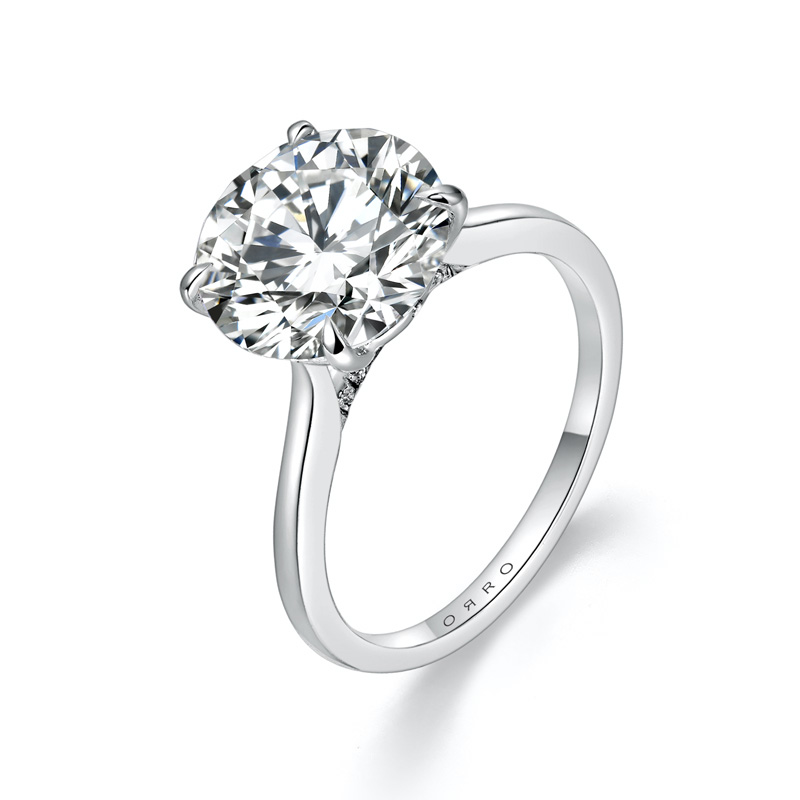 The ORRO Benecia Ring embodies a timeless blend of classic elegance and contemporary design. A single, stunning round brilliant diamond takes center stage, held securely by four prongs that branch gracefully from the band. The ring's most captivating feature is the fully exposed cutlet of the diamond, creating the illusion of the diamond floating above the band. Adding to its allure, a section of the band directly beneath the diamond is delicately paved with shimmering melee diamonds, offering a subtle touch of brilliance to complement the centerpiece. The ORRO Benecia Ring is an iconic choice for those who appreciate understated sophistication.